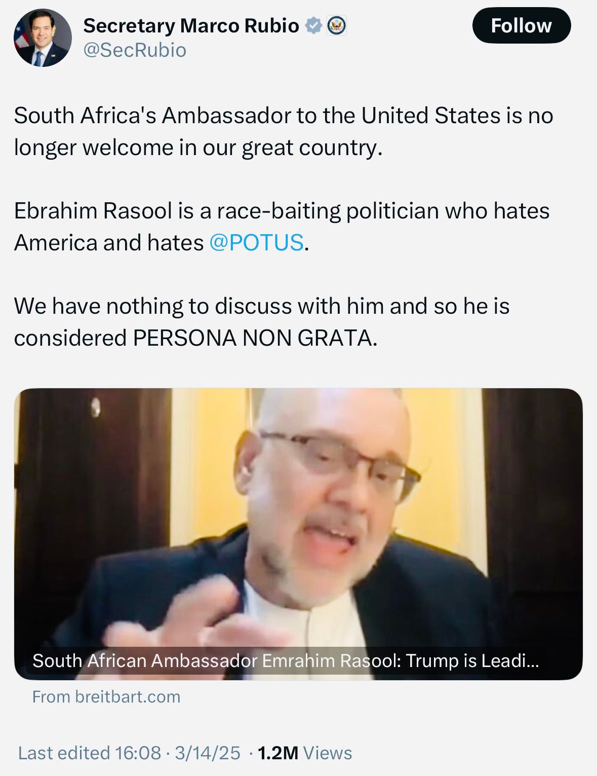 โSouth Africaโs Ambassador to the United States is no longer welcome in our great country,โ Rubio said in a post on social media platform X.