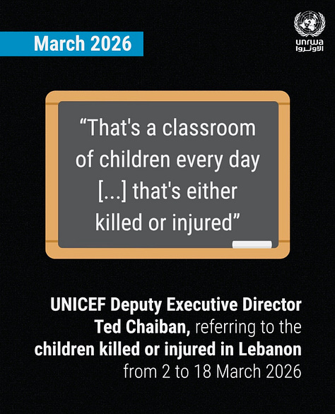 More than 1.2 million people - a fifth of the population - have been displaced in Lebanon since 2 March due to Israeli airstrikes and forced displacement orders including 350,000 children. More than 1,000 people have been killed, including more than 120 children with a further 380 or more children injured.